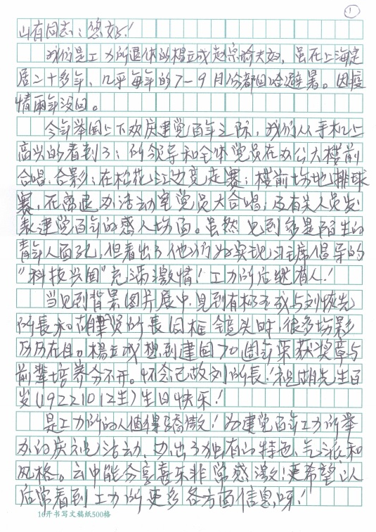 發(fā)布時間: 2021-08-20 點擊數(shù)量:4504“以人性化服務(wù)和溫情服務(wù)為宗旨,努力做到讓老同志方便、放心、滿意,感受到家人般的溫暖”,這是離退休辦公室的服務(wù)宗旨。近日,一封感謝信從遠在上海定居的老同志寄來,信里表達了對工力所在建黨百年之際取得的成績感到驕傲和自豪,重點感謝了離退辦同志對異地居住和就醫(yī)的老同志給予生活上和就醫(yī)方面的關(guān)心和幫助。他飽含感激之情地講述了幾件事,他說“我們講述幾件個人小事,但能說明工力所不單培養(yǎng)科技人才,為民辦事一般工作人員也是稱職的。”“全心全意為人民服務(wù)的精神傳遞了黨和政府對老年人的關(guān)愛”……老同志口中的小事都是我們?yōu)槿罕姺?wù)的大事,我們要為群眾辦真事、真辦事。
