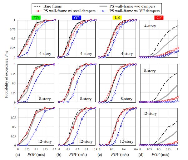 本文通過非線性時程分析和多維地震易損性分析,研究了兩種阻尼器(即摩擦型阻尼器和黏彈性阻尼器)在減小鉸支墻-框架結構層間位移、樓面速度和加速度地震反應中的作用。可以得到以下結論: