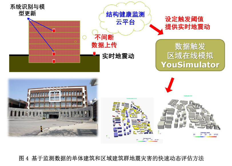項目集成了新型傳感器、先進的組網(wǎng)技術、秒級計算效率的基于監(jiān)測數(shù)據(jù)的單體建筑和區(qū)域建筑群地震災害的快速動態(tài)評估方法(圖4)等創(chuàng)新性成果,開發(fā)了“區(qū)域與城市地震監(jiān)測與風險動態(tài)評估系統(tǒng)”(圖5),實現(xiàn)了基于監(jiān)測數(shù)據(jù)的公里網(wǎng)格級別的地震災害風險快速動態(tài)評估,提升了區(qū)域與城市地震災害風險評估的時效性和精度。