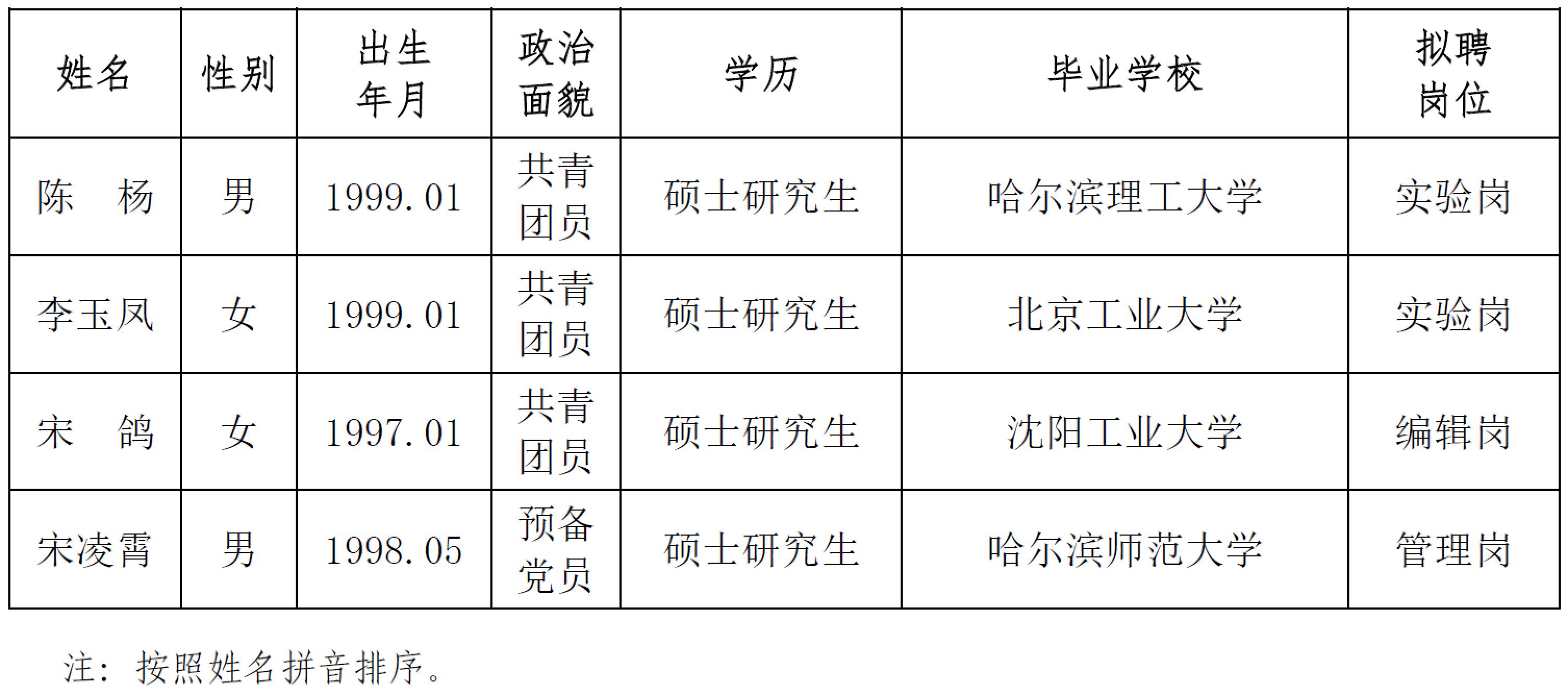 發布時間: 2024-05-14 點擊數量:12634根據中國地震局《關于貫徹執行〈事業單位公開招聘人員暫行規定〉的通知》文件精神和我所用人計劃,經公開發布招聘信息、資格審查、面試等程序確定擬錄人員。現將擬錄人員相關情況公示如下,公示期7個工作日,期間如有異議請與中國地震局工程力學研究所人才資源部或紀檢室聯系,以個人名義反映情況的領署真實姓名,以單位名義反映情況的須加蓋公章。