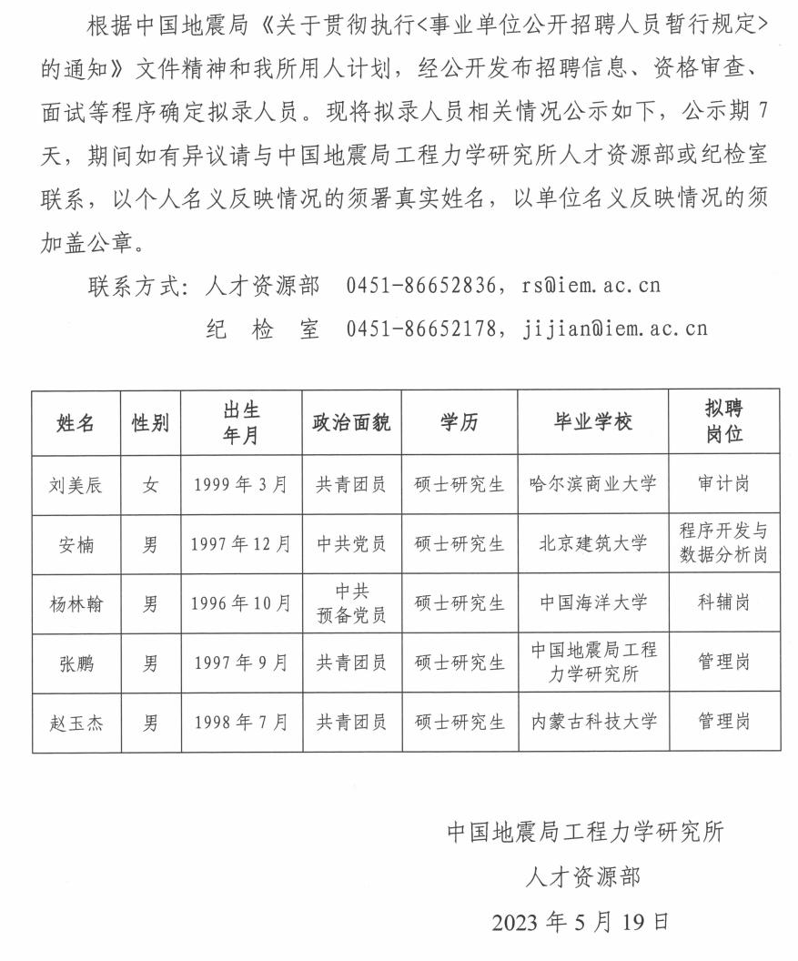 中國(guó)地震局工程力學(xué)研究所2023年擬錄用人員公示(二)